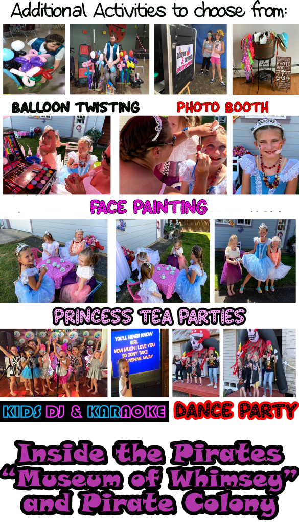 WE really try to be a one stop birthday/celebration shop — a smorgasbord of family fun. Our prices are quite simple with BIRTHDAY parties starting at $300 00 ~~ 2 hours (1/2 deposit down to secure date.) Each party is different with you deciding what you would like for your celebration. (ie. face painting, balloon twisting, karaoke, etc)